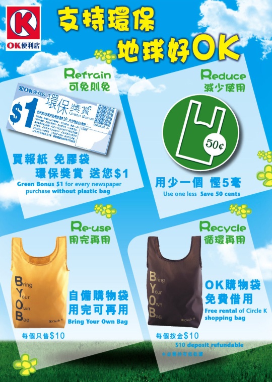 ![]() OK便利店一向著重有關環保概念的教育性宣傳,以提醒顧客保護環境之「四大理念」: 可免則免、減少使用、用完再用及循環再用。 此外, OK便利店亦致力減少紙張浪費,除非顧客主動提出要求,否則不會為顧客提供收據。 ![]()