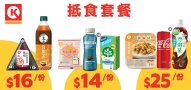 Circle K超值套餐優惠Lunch唔怕餓?飯飯店飯盒加可樂/雪碧/芬達/維他冷泡無糖茶。 鍾意飯糰?配埋淳茶舍。追求健康早餐?Circle K夾心飛碟加維他奶鈣思寶豆奶/雀巢 CAFE 系列咖啡。Share
