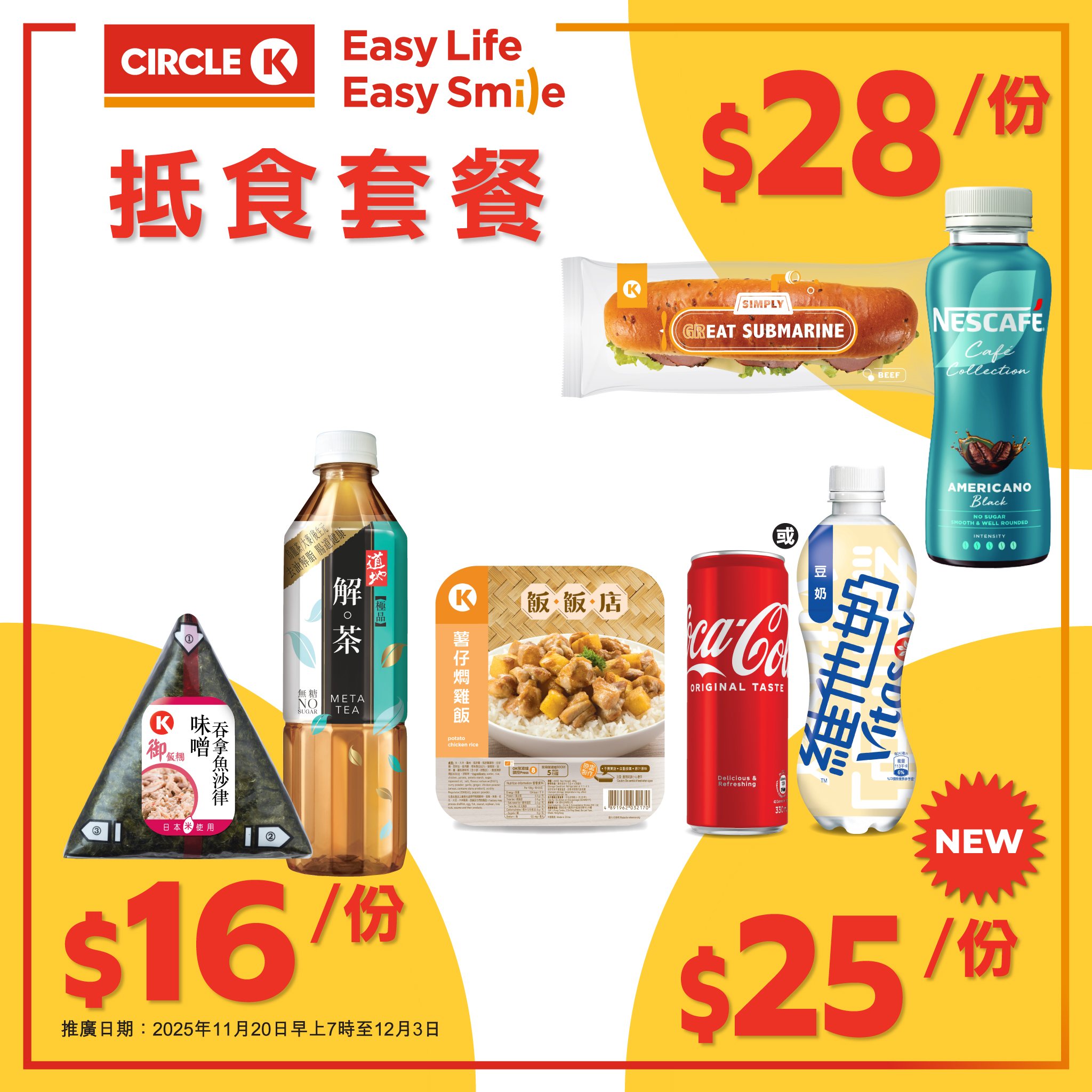 Lunch唔怕餓?飯飯店飯盒加可樂/雪碧/芬達(330毫升)/維他奶(480毫升)。 鍾意飯糰?配埋道地極品無糖茶(500毫升)。朝早要醒神?潛艇三明治加雀巢CAFE系列咖啡(270毫升)